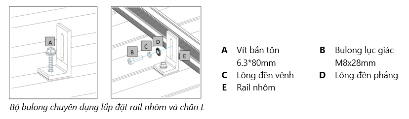 Bước 4: Lắp đặt rail nhôm. Rail nhôm liên kết với chân đỡ L feet bằng bộ bulong chuyên dụng.