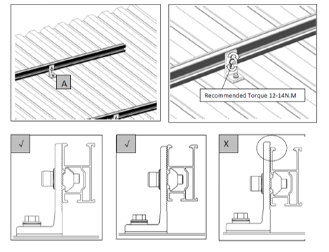 Rail nhôm lắp đặt phải cao hơn chân L feet, đồng thời lực siết của bulong phải đảm bảo đúng với tiêu chuẩn kỹ thuật của nhà cung cấp (12-14Nm).
