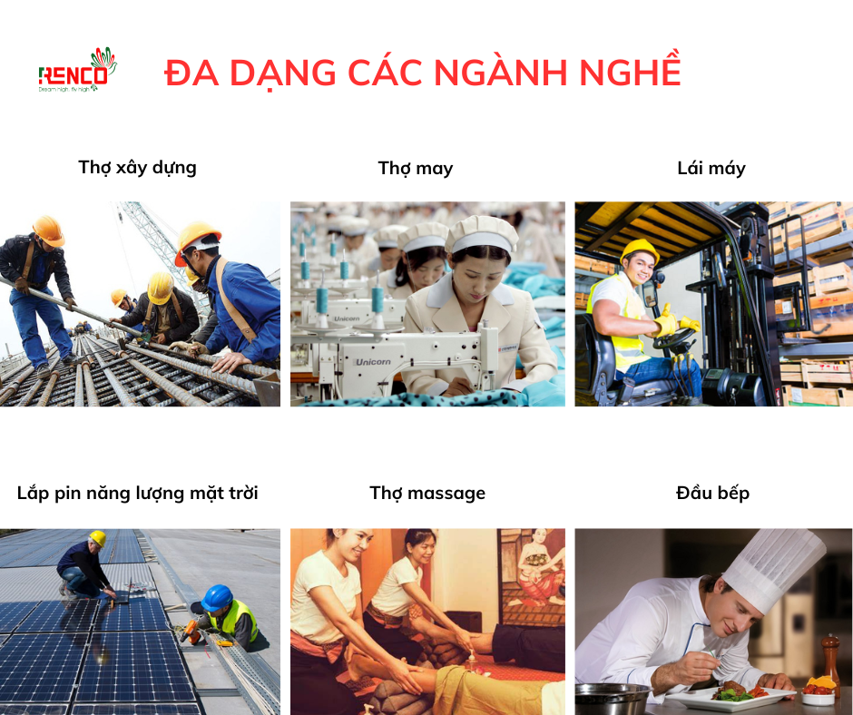 - Xây dựng: Thợ nề, thợ mộc, thợ điện, lai máy lu, máy cẩu,…